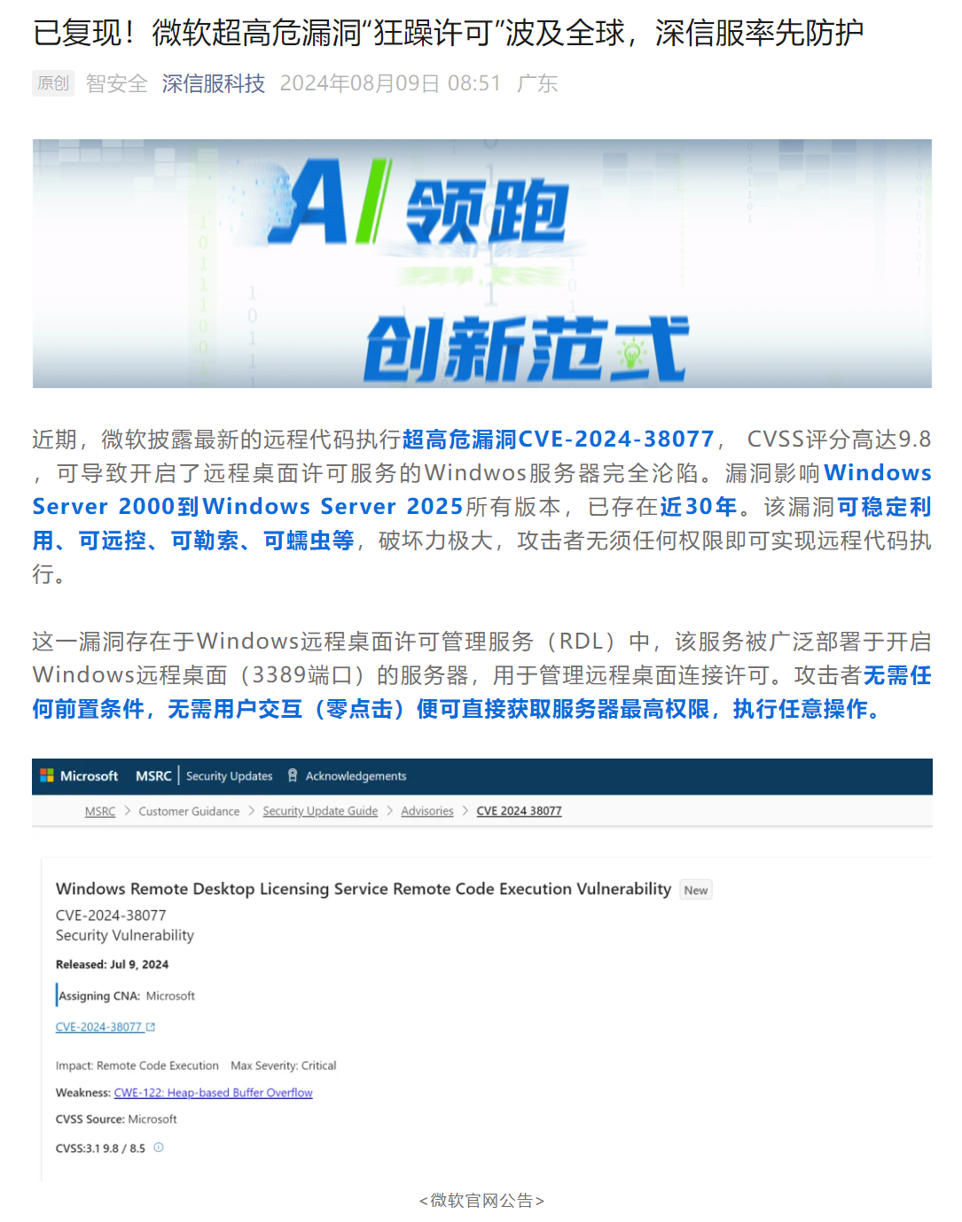 微软披露最新的远程代码执行超高危漏洞CVE-2024-38077, CVSS评分高达9.8 ,可导致开启了远程桌面许可服务的Windwos服务器完全沦陷。漏洞影响Windows Server 2000到Windows Server 2025所有版本,已存在近30年。该漏洞可稳定利用、可远控、可勒索、可蠕虫等,破坏力极大,攻击者无须任何权限即可实现远程代码执行。
