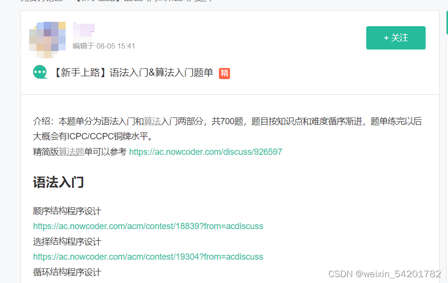 个人推荐牛客网上面有一个新手入门题单,我刷了有200多道题目吧,感觉里面的题目加上在线的oj平台非常适合我这种类型的选手,强烈不建议到杭电OJ去刷题,这个网站延迟会很大,一个程序提交之后,会很卡。(这里强烈推荐牛客OJ和洛谷的OJ)