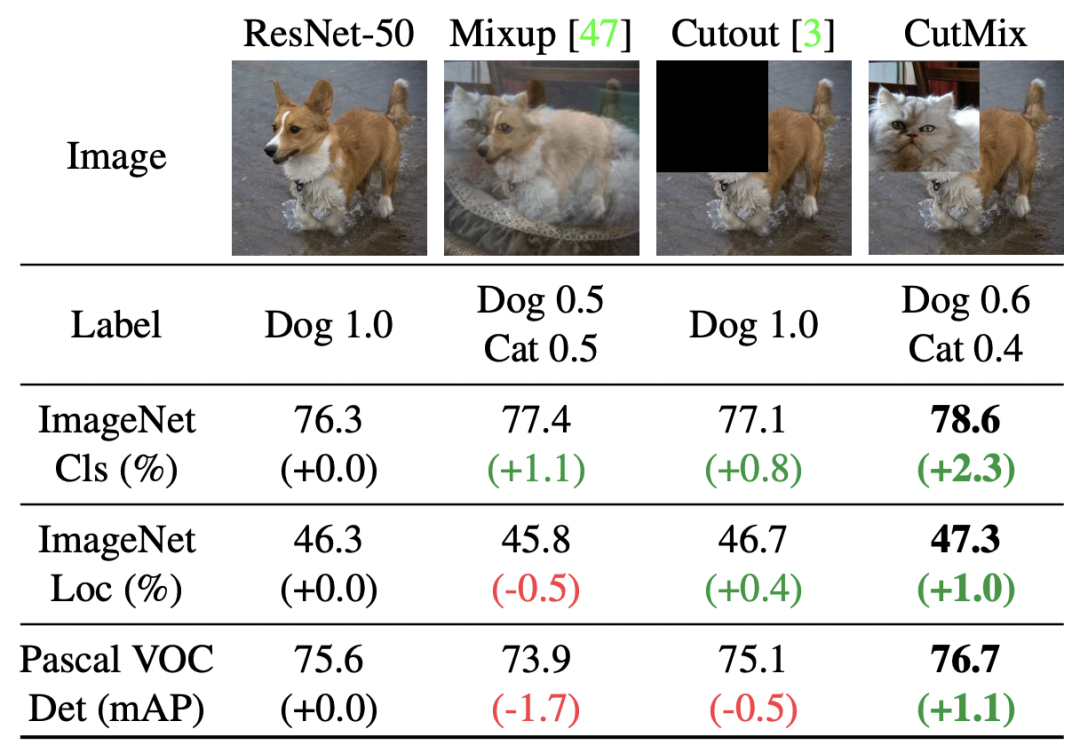 类似的方法还包括CutMix: Regularization Strategy to Train Strong Classifiers with Localizable Features(ICCV 2019)提出的一种对Mixup方法的扩展,随机选择两个图像和label后,对每个patch随机选择是否使用另一个图像相应的patch进行替换,也起到了和Mixup类似的效果。文中也对比了Mixup和CutMix的效果,Mixup由于每个位置都进行插值,容易造成区域信息的混淆,而CutMix直接进行替换,不同区域的差异更加明确。