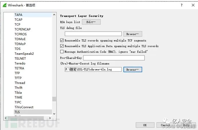 将-keylogfile 参数指定的文件,配置到wireshark的Edit -> Preferences -> Protocols -> TLS,(Pre)-Master-Secret log中: