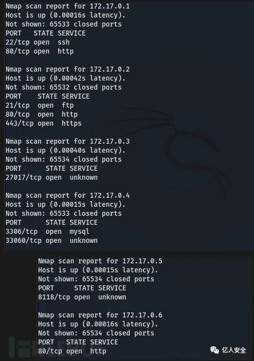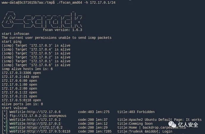 172.17.0.1:端口 22,80 172.17.0.2:端口 21、80、443 - BACKDROP CMS 和 FTP 端口 172.17.0.3:端口27017 - MongoDB服务器 172.17.0.4:端口 3306、33060 - MySQL server for 172.17.0.5:端口 8118 - Trudesk v1.1.11