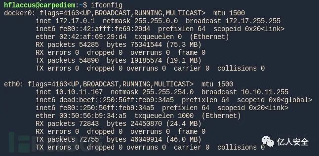 我们还可以寻找其他 docker 容器或主机。检查 /etc/hosts 我们找到我们的和另一个 IP 地址: