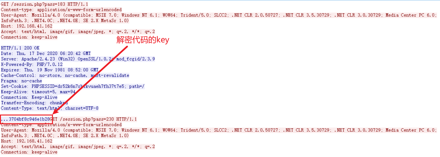 流量特征共分为两次get请求,第一次请求服务端产生密钥写入session,第二次请求用于获取key