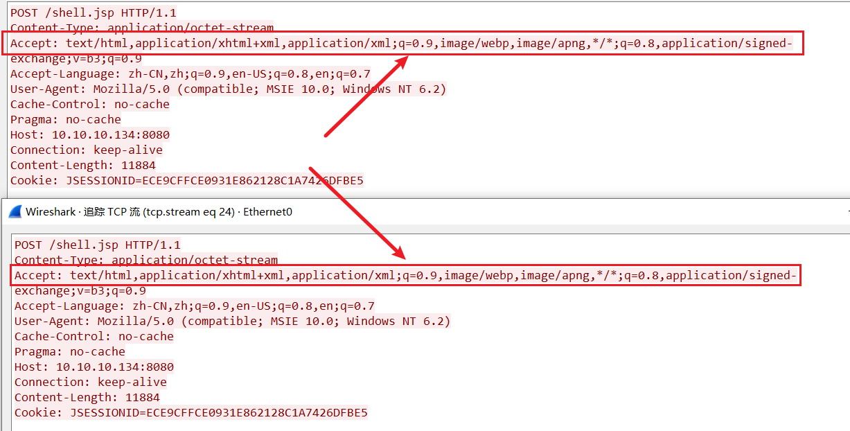 1、冰蝎2默认Accept字段的值很特殊,而且每个阶段都一样
