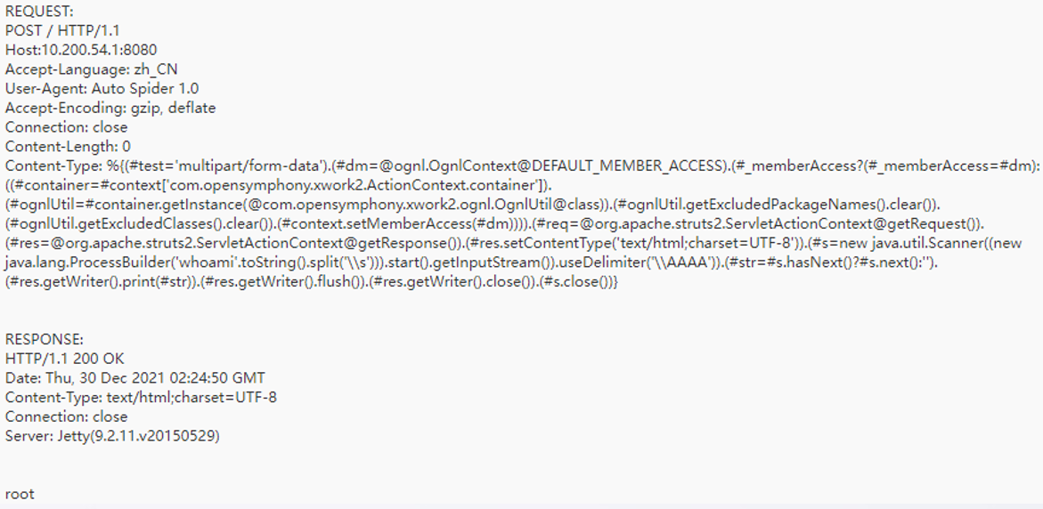 4.执行命令“whoami”,返回包中返回执行成功信息“root”