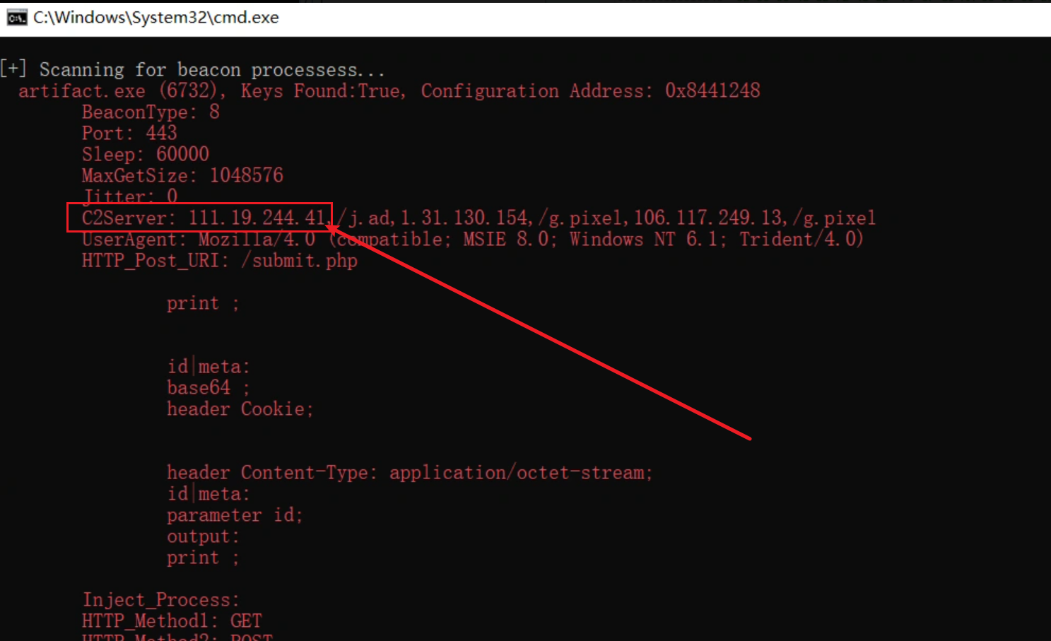 BeaconEye的核心原理是通过扫描 CobaltStrike中的内存特征,并进行 BeaconConfig扫描解析出对应的Beacon信息,项目地址是