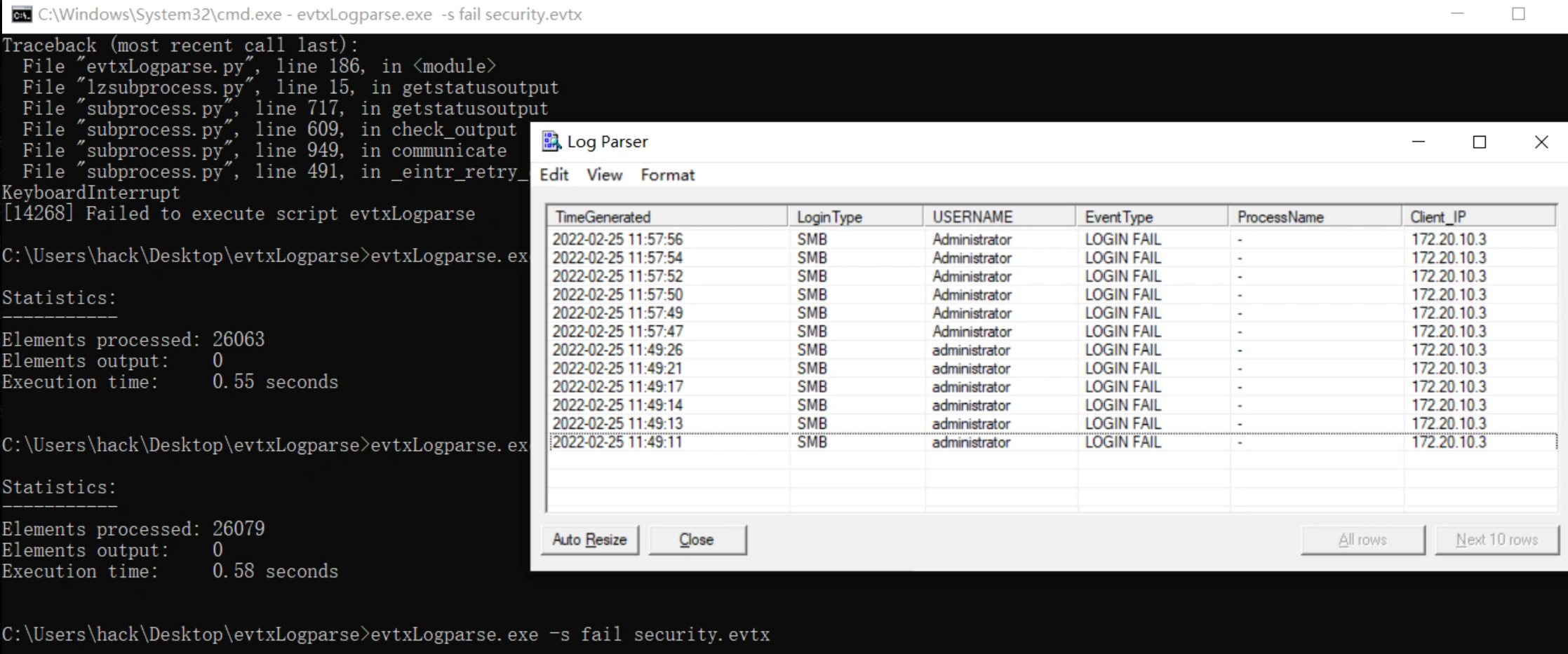 evtxLogparse.exe -s fail security.evtx #SMB登录失败
