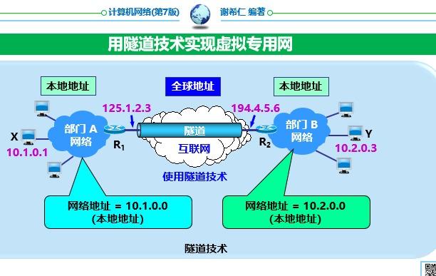 基本首部(固定的 40 字节) 有效载荷(净负荷)。允许有 0 个或多个扩展首部,之后才是数据部分 6. 虚拟专用网 V** IP 地址的紧缺 :一个机构能够申请到的 IP 地址数往往小于本机构所拥有的主机数互联网不是很安全 :一个机构内并不需要把所有的主机接入到外部的互联网6.1 本地地址和全球地址 本地地址 :仅在机构内部使用的 IP 地址,可以由本机构自行分配,而不需要向互联网的管理机构申请