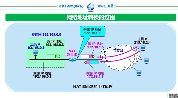 7. 网络地址转换 NAT 需要在专用网连接到互联网的路由器上安装 NAT 软件。装有 NAT 软件的路由器叫做NAT 路由器,它至少由一个有效的外部全球 IP 地址 所有使用本地地址的主机在和外界通信时,都要在 NAT 路由器上将本地地址转换成全球 IP 地址 ,才能和互联网连接 在内部主机于外部主机通信时,在 NAT 路由器上发生了两次地址转换