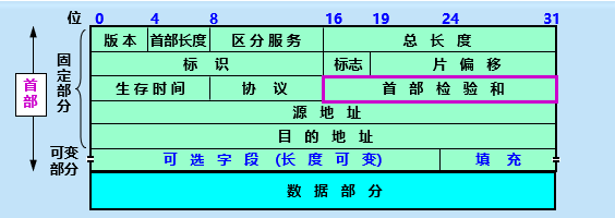 发送方是主机,要把 IP 数据报发送到本网络上的另一个主机。可以用 ARP 找到目的主机的硬件地址。 发送方是主机,要把 IP 数据报发送到另一个网络上的一个主机。用 ARP 找到本网络上的一个路由器的硬件地址,剩下的交给这个路由器。 发送方是路由器,要把 IP 数据报发送到本网络上的一个主机。可以用 ARP 找到目的主机的硬件地址。 发送方是路由器,要把 IP 数据报发送到另一个网络上的一个主机。用 ARP 找到本网络上的另一个路由器的硬件地址,剩下的交给这个路由器。 2.5 IP 数据报的形式 一个数据报由首部 和数据 两部分组成 首部的前一部分是固定长度,一共 20 字节,是所有 IP 数据报必须具有的 首部的固定部分的后面是一些可选字段,长度可变 首部检验和的计算采用 16 位二进制反码求和算法。这个字段只检验数据包的首部,不包括数据部分
