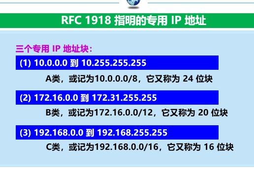 RFC1918 指明了一些专用地址 ,专用地址只能用作本地地址 ,不能用于全球地址。在互联网中的所有路由器,对目的地址是专用地址的数据报一律不进行转发