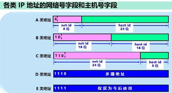 IP 地址第一位是 0 时属于 A 类地址,IP 地址前 2 位是 10 时属于 B 类地址,IP 地址前 3 位是 110 时属于 C 类地址 A 类地址的网络号字段为 1 字节,主机号字段为 3 字节;B 类地址的网络号字段为 2 字节,主机号字段为 2 字节; C 类地址的网络号字段为 3 字节,主机号字段为 1 字节 点分十进制记法:
