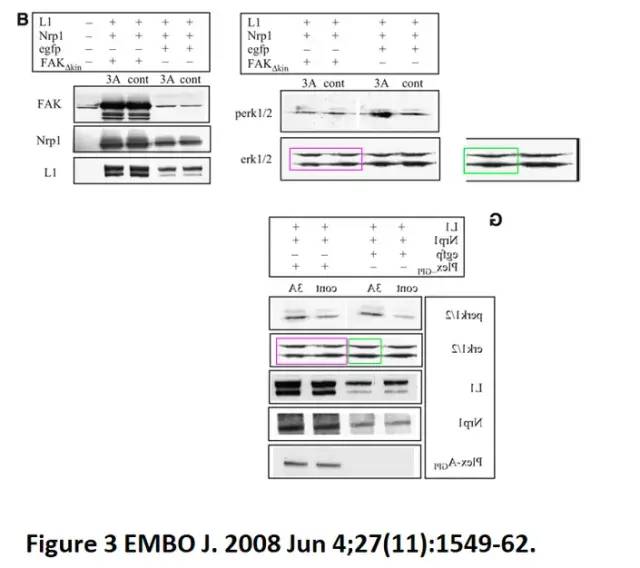 一条凝胶带似乎被镜像处理,在同一张图中直接翻转并重复使用(截自EMBO论文,2008年)