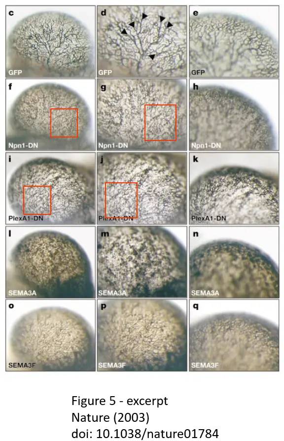 而2003年发表在Science上的另一篇论文,Tessier-Lavigne被列为14位作者中的第四位,文中包含一系列被描述为彼此不同的图片。但是根据Bik的说法,它们看起来实际上是同一幅图,只是进行了旋转。