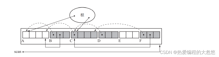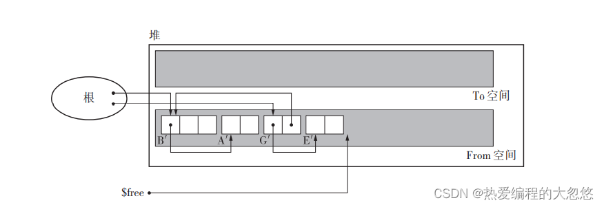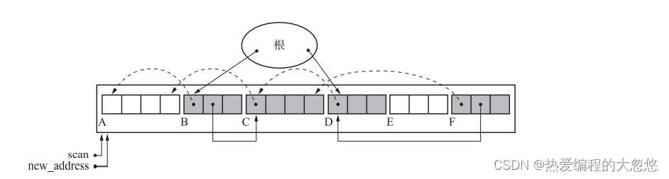 通过TO和FROM指针不断前移,将因标记清除算法产生的碎片空间进行整理,而原先整理好的空间又可能因为应用了标记清除算法而产生新的垃圾,就这样不断重复。