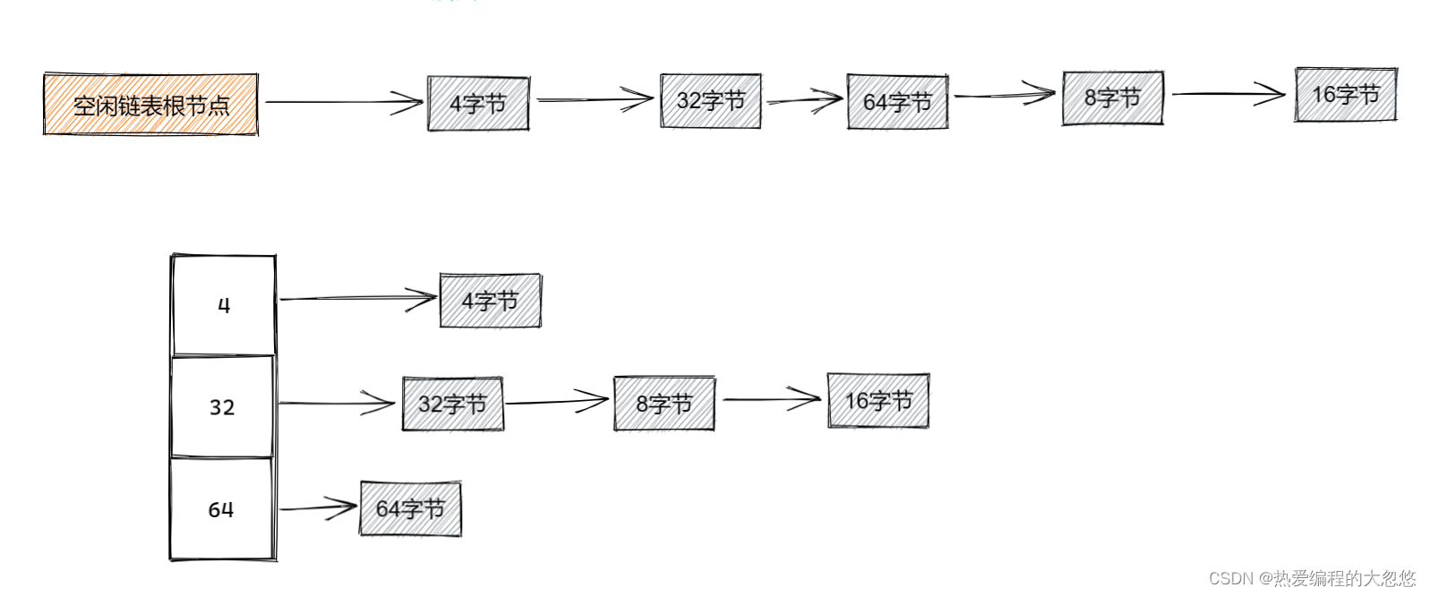 此时,我们可以借鉴伙伴算法的思想,采用数组+链表的形式:
