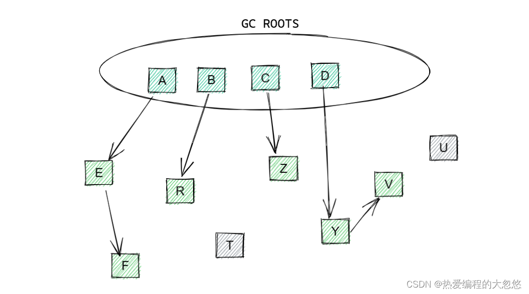 存在于GC ROOTS集合中某个对象引用链上的对象被称为此刻的活动对象,而无法通过引用链找到的对象就被称为此刻的非活动对象,也就是垃圾对象。