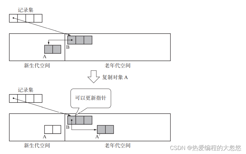 如果我们只是针对新生代进行垃圾回收,那么光光枚举GC ROOTS还不够,因为可能存在老年代中某个对象引用新生代中对象的事情发生,因此我们需要使用一种全局数据结构来指明当前老年代中存在哪些跨代引用,这种数据结构被称为记忆集。
