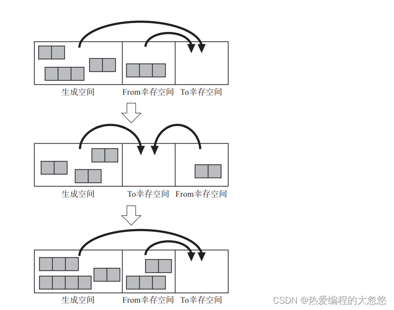 新生代空间被划分为了生成空间,From空间和To空间三部分,每次new创建的对象保存在生成空间,经历了一次GC后,存活的对象,全部复制到To空间保存,然后交换From和To的指针。