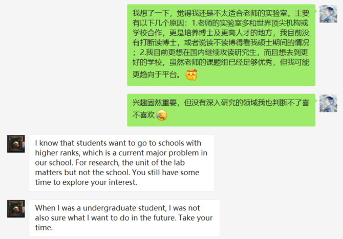 我在这个时候第一次拒绝了老师,正如我所答复的一样,是否读博士要看我硕士的情况。