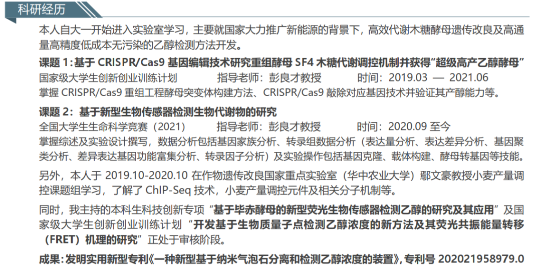 其次是要列出你的成果,不管是挑战杯证书、专利,还是SCI论文等都要写清楚题目、第几作者/第几发明人等。