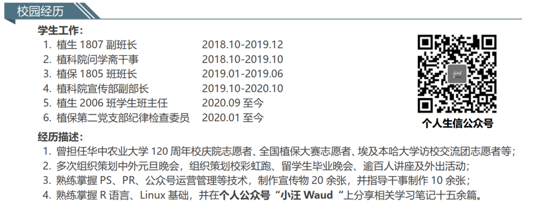 研究生的导师少有看重学生的校园经历的,我的想法是该部分虽然次于科研经历,但从某种方面又能体现出学生的性格和能力。我在简历里列出了我参与过的学生工作(协会的话我建议如果排版需要就放),简单的描述了我大学的经历,同时将个人公众号放了上去。