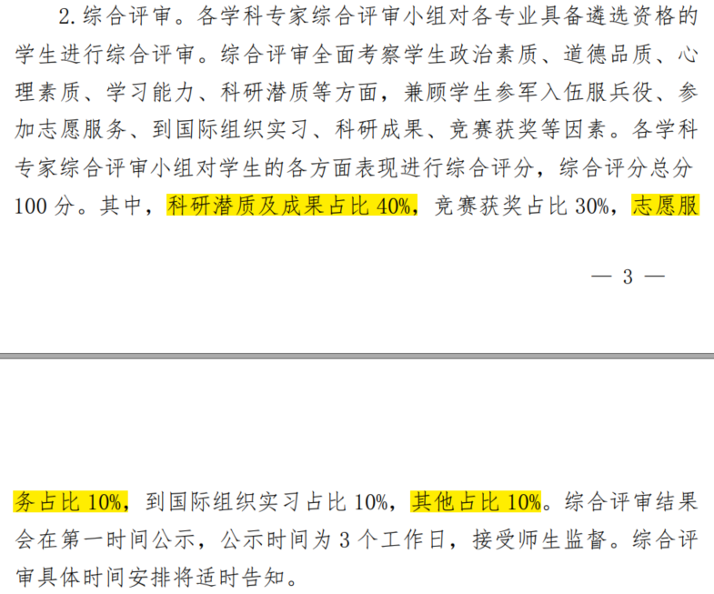 这100分中,科研占大头,折合一下可以占总分中的8分,竞赛获奖的人是少数,志愿服务大家都差不多;由于疫情缘故,我们专业也没有到国际组织实习的同学,因此科研材料这一块得好好打磨。