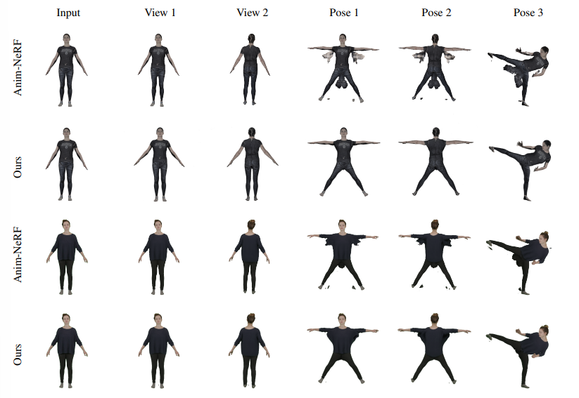 作者首先展示了其方案在新视角生成和新姿态生成两个任务上的表现。可以发现,和对比方法相比,作者的方案明显有着更少的噪声,对于新的姿态适应性也较好。