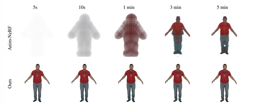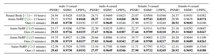 如下表所示,作者在PeopleSnapshot数据集上和目前的方法进行了比较。其中,他们主要比较了PSNR、SSIM和LPIPS等指标,可以发现他们的收敛速度相比之下有明显的优势,并且在充分训练的情况下和当前的SoTA方法效果接近甚至更优。