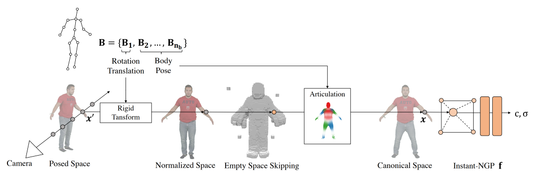 对于每一帧,作者沿着目标姿态空间中的光线采样点。然后,作者将这些点转换到归一化空间(Normalized Space),在该空间中作者移除了人的全局旋转方向和平移。在这个归一化空间中,作者使用占用网格(Occupancy Grid)过滤空白空间中的点。其余点使用关节模块变形到规范空间(Canonical Space),然后输入规范空间的神经辐射场,以获取颜色和密度。