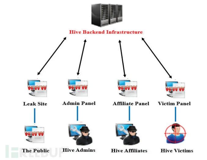 为了跑通"勒索软件即服务"模式,Hive管理员建立了一个服务器网络来运行他们的在线犯罪业务。网络面向公众的一侧或“前端”由四个可访问的网站或“面板”组成,每个网站都面向不同类型的用户/受众。一个由Hive参与者使用的但公众无法访问的单独服务器托管了一个支持前端Tor的数据库面板和泄漏网站。