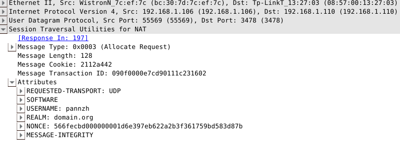 在下一次request请求中,客户端加上了收到的nonce,以及USERNAME和REALM等属性,再次发送到TurnServer:
