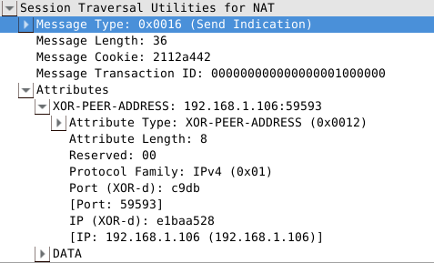 通过对TurnServer发送indication告知数据的接收方以及数据内容让TurnServer进行转发,从而间接地向对等端发送DATA. 而从对等端来看,就是收到一个从client的relay地址192.168.1.110:65315到目的地址192.168.1.106:59593(即peer地址)的UDP数据包.