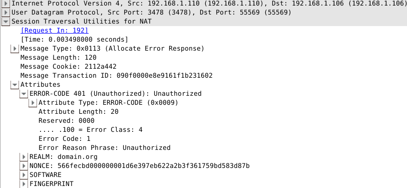 可以看到第一次requst被服务器拒绝,因为后者要求nonce验证信息,服务器的返回中包含了nonce信息, 除此之外还包含了ERROR-CODE,SOFTWARE,FINGERPRINT属性.