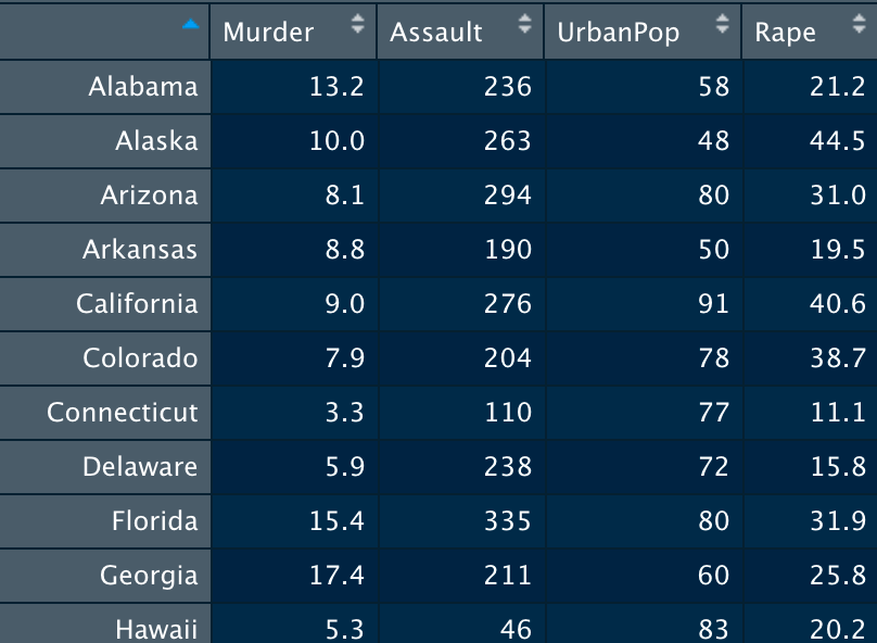 USArrests: https://www.rdocumentation.org/packages/datasets/versions/3.6.2/topics/USArrests