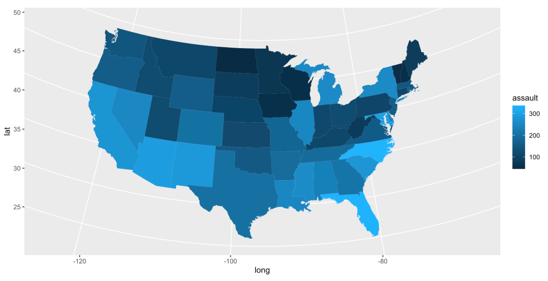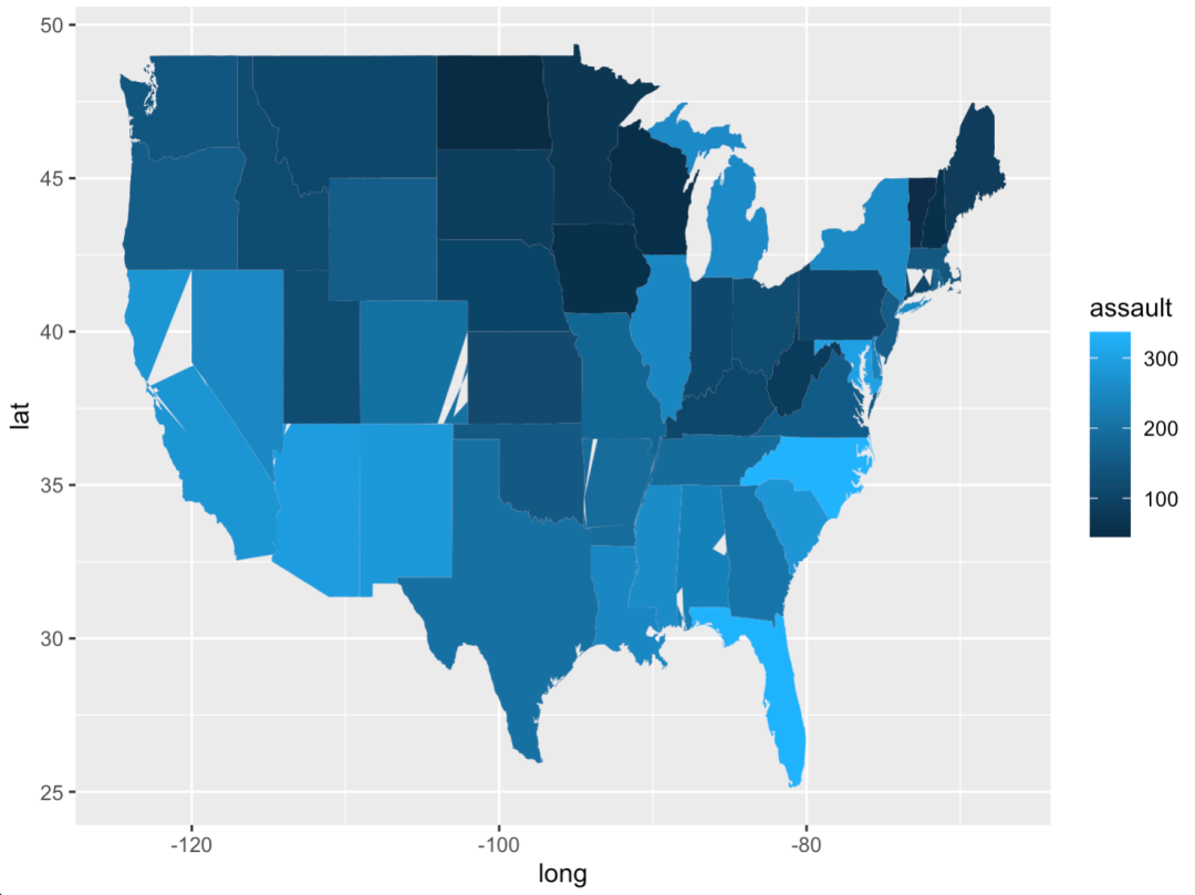 choro <- merge(states, arrests, sort = FALSE, by = "region") # 通过region合并states和arrests