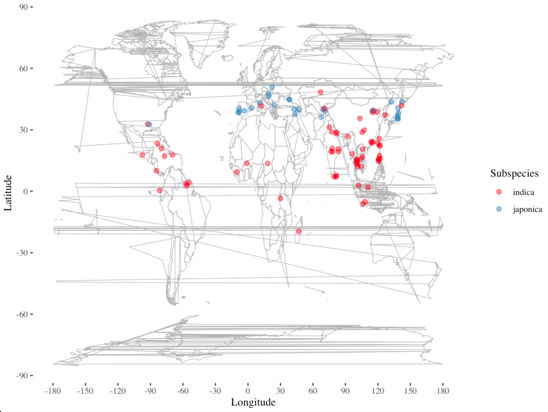 图1 a主要介绍了本研究中样本籼稻(indica)和粳稻(japonica)的位置。