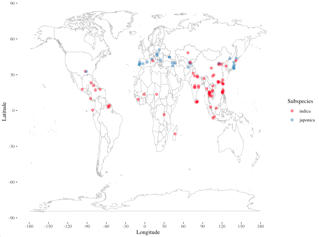 labs(x="Longitude", y="Latitude", colour = "Subspecies" ) + # 修改X轴、Y轴及图例
