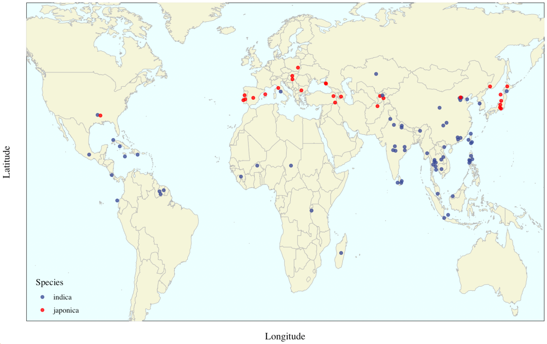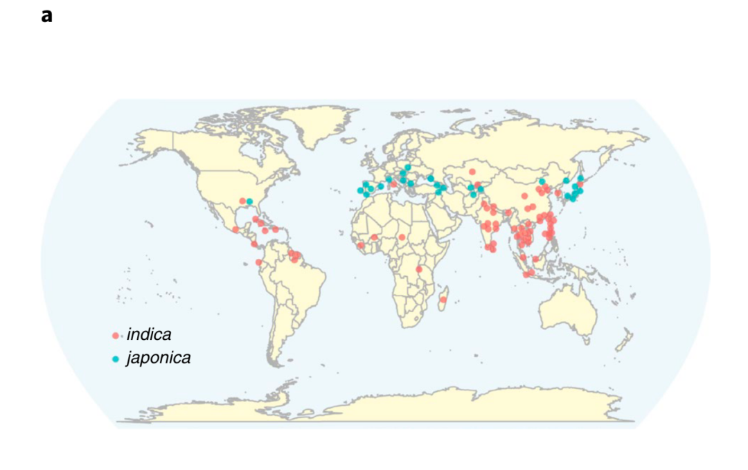 图1 a Diagram of original collection sites (44 countries) of indica (red) and japonica (blue) rice