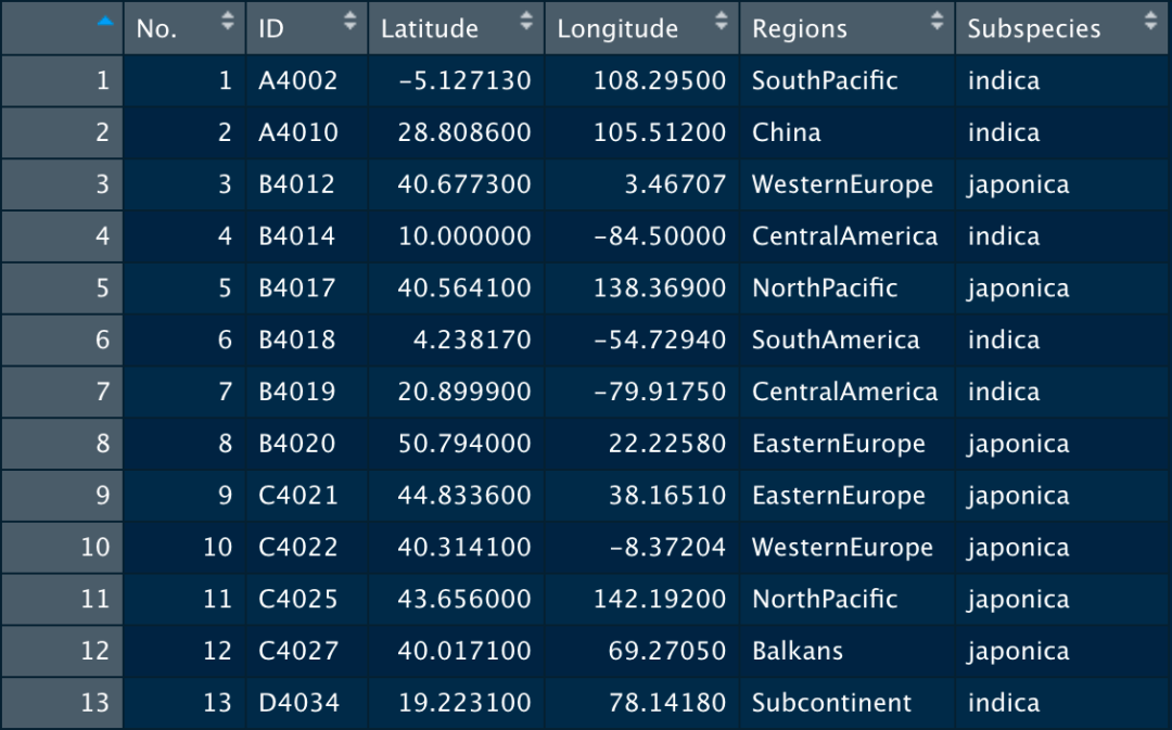 在作图之前我们需要准备「包含样本地理位置信息的表」,至少包含品种和经纬度。