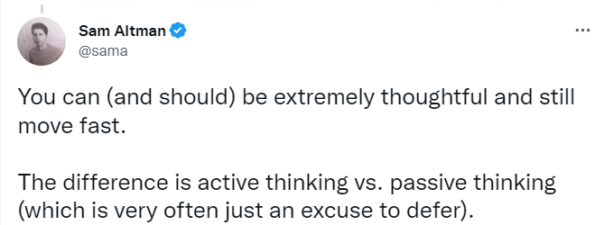 与此同时,就在一年前,OpenAI 的首席执行官萨姆 · 奥特曼(Sam Altman)还鼓励加速,他在 Twitter 上写道: “你可以(也应该)非常周到并且仍然快速行动。区别在于主动思考与被动思考(这通常只是推迟的借口)。”