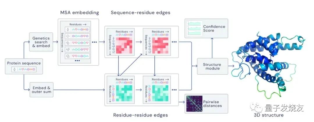 AlphaFold2主要通过预测蛋白质中每对氨基酸之间的距离分布,以及连接它们的化学键之间的角度将所有存在的氨基酸对的测量结果汇总成2D形式的距离直方图,然后让卷积神经网络对这些图片进行学习,从而构建出蛋白质的3D结构。AlphaFold2主要架构如下图: