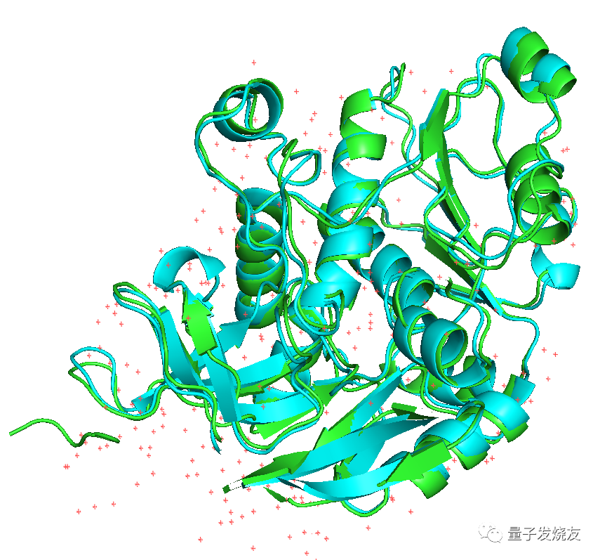 图中显示的是327aa的蛋白与同源结构最高identities = 30%的结构预测结果(青色为预测的,绿色的为解析出来的结构)。两个结构RMSD=0.86埃,预测结果非常好。说明AlphaFold2的预测准确性是很高的。