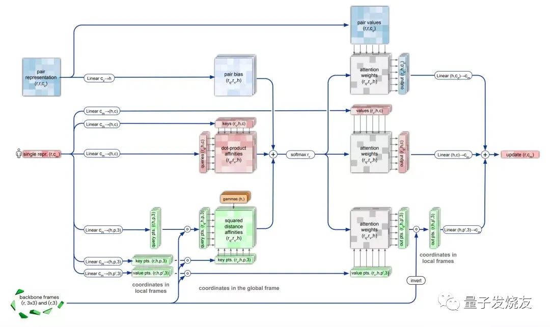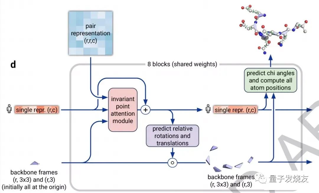 在结构模块中,研究人员同样使用了Attention机制,它可以单独计算蛋白质的各个部分,称为“不变点注意力机制”。是以某个原子为原点,构建出一个3D参考场,根据预测信息进行旋转和平移,得到一个结构框架。具体步骤如下: