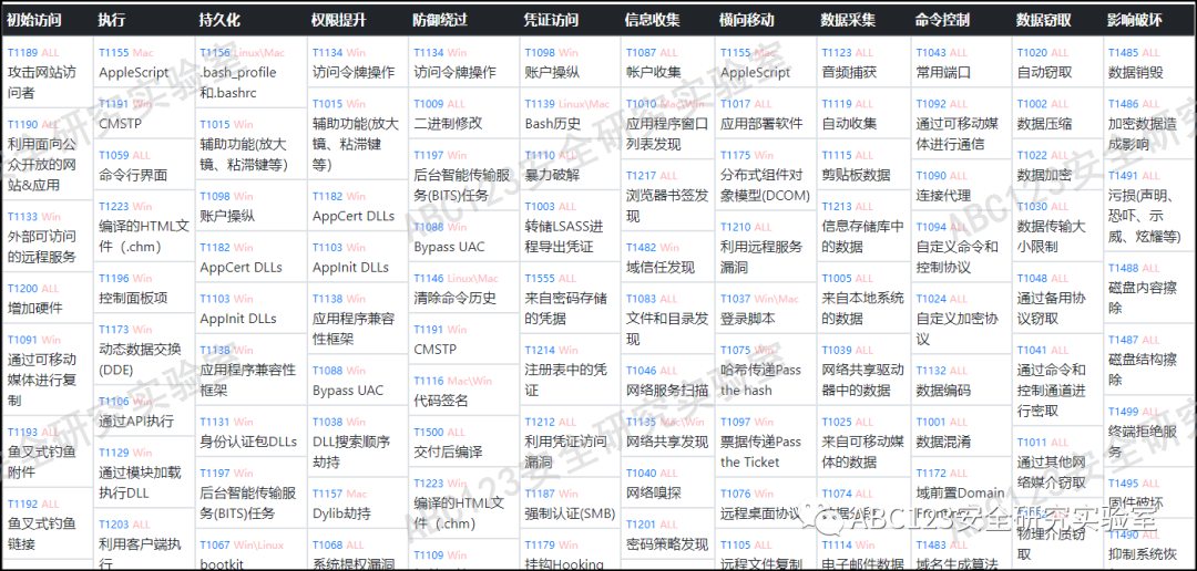 以下这张图是ATT&CK矩阵攻击战术列表的中文翻译版,涵盖了从初始访问一直到窃取数据的整个流程,部分中文翻译结果,在不同的APT案例应用中会有所不同,大家要灵活地对待中文翻译结果,灵活地进行修改。横轴是战术,纵轴是技术及子技术,每个技术都有单独的ID编号,都带有网页链接,点开后可以看到每一项技术的详细介绍。这里需要注意的是,ATT&CK矩阵并没有规定战术的前后顺序,也不需要每次APT攻击都包括所有10几个战术。毕竟对于真实的APT攻击来说,越少的战术,越不容易被发现。