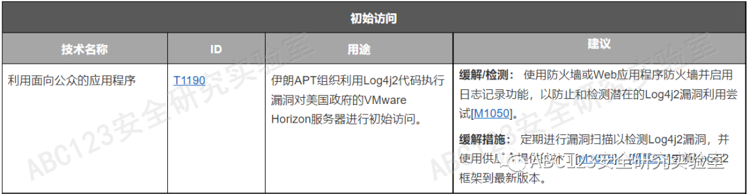 如下所示,伊朗APT组织通过“初始访问”战术中的“利用面向公众的应用程序”技术(Log4j2框架的代码执行漏洞)建立了初始据点。