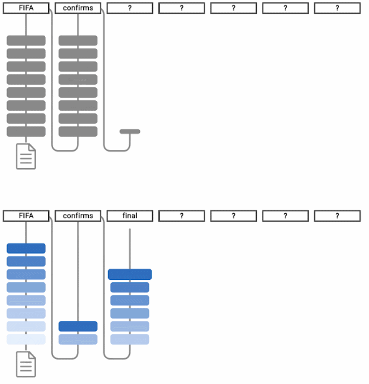 使用常规语言模型(top)和 CALM (bottom)生成文本。CALM 试图做出早期预测。一旦对生成的内容足够自信(深蓝色调),它就会跳过来节省时间。