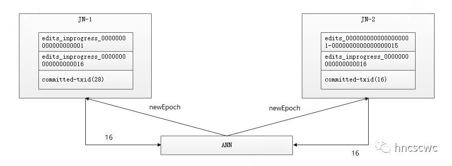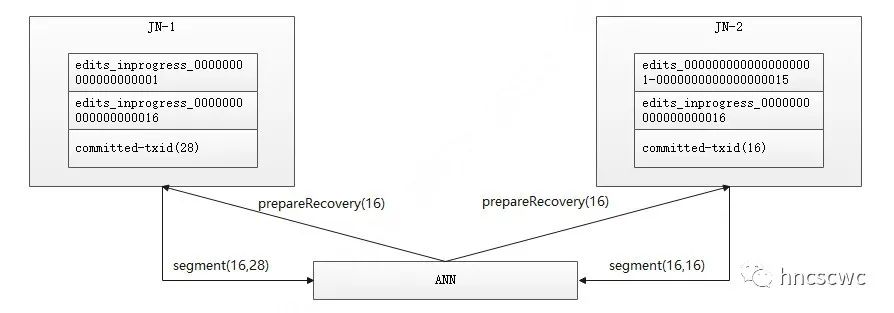 接着上图的流程,jn-1中,已经处理了事务ID为28的editlog请求,因此返回16-28。而jn2仅处理到16的事务ID(之前出现了异常,导致后续的editlog没有写进来),因此返回16-16。